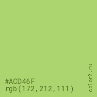Цвет #ACD46F в цветовой модели RGB обозначается тремя октетами (172, 212, 111) в десятичном формате и #ACD46F в шестнадцатиричном (hex) формате, которые являются интенсивностью красного 172 (hex AC), интенсивность зелёного 212 (hex D4) и интенсивность синего 111 (hex 6F).