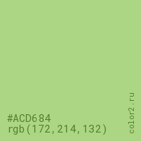 Цвет #ACD684 в цветовой модели RGB обозначается тремя октетами (172, 214, 132) в десятичном формате и #ACD684 в шестнадцатиричном (hex) формате, которые являются интенсивностью красного 172 (hex AC), интенсивность зелёного 214 (hex D6) и интенсивность синего 132 (hex 84).