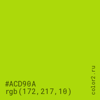 Цвет #ACD90A в цветовой модели RGB обозначается тремя октетами (172, 217, 10) в десятичном формате и #ACD90A в шестнадцатиричном (hex) формате, которые являются интенсивностью красного 172 (hex AC), интенсивность зелёного 217 (hex D9) и интенсивность синего 10 (hex 0A).