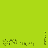Цвет #ACDA16 в цветовой модели RGB обозначается тремя октетами (172, 218, 22) в десятичном формате и #ACDA16 в шестнадцатиричном (hex) формате, которые являются интенсивностью красного 172 (hex AC), интенсивность зелёного 218 (hex DA) и интенсивность синего 22 (hex 16).