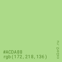 Цвет #ACDA88 в цветовой модели RGB обозначается тремя октетами (172, 218, 136) в десятичном формате и #ACDA88 в шестнадцатиричном (hex) формате, которые являются интенсивностью красного 172 (hex AC), интенсивность зелёного 218 (hex DA) и интенсивность синего 136 (hex 88).