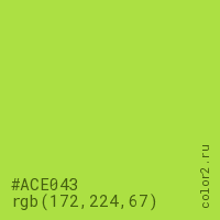 Цвет #ACE043 в цветовой модели RGB обозначается тремя октетами (172, 224, 67) в десятичном формате и #ACE043 в шестнадцатиричном (hex) формате, которые являются интенсивностью красного 172 (hex AC), интенсивность зелёного 224 (hex E0) и интенсивность синего 67 (hex 43).