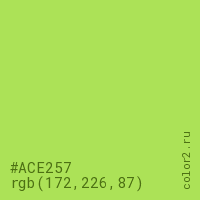 Цвет #ACE257 в цветовой модели RGB обозначается тремя октетами (172, 226, 87) в десятичном формате и #ACE257 в шестнадцатиричном (hex) формате, которые являются интенсивностью красного 172 (hex AC), интенсивность зелёного 226 (hex E2) и интенсивность синего 87 (hex 57).