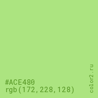 Цвет #ACE480 в цветовой модели RGB обозначается тремя октетами (172, 228, 128) в десятичном формате и #ACE480 в шестнадцатиричном (hex) формате, которые являются интенсивностью красного 172 (hex AC), интенсивность зелёного 228 (hex E4) и интенсивность синего 128 (hex 80).