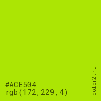 Цвет #ACE504 в цветовой модели RGB обозначается тремя октетами (172, 229, 4) в десятичном формате и #ACE504 в шестнадцатиричном (hex) формате, которые являются интенсивностью красного 172 (hex AC), интенсивность зелёного 229 (hex E5) и интенсивность синего 4 (hex 04).