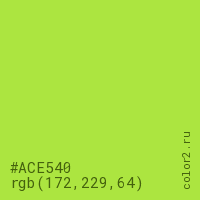 Цвет #ACE540 в цветовой модели RGB обозначается тремя октетами (172, 229, 64) в десятичном формате и #ACE540 в шестнадцатиричном (hex) формате, которые являются интенсивностью красного 172 (hex AC), интенсивность зелёного 229 (hex E5) и интенсивность синего 64 (hex 40).