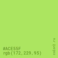 Цвет #ACE55F в цветовой модели RGB обозначается тремя октетами (172, 229, 95) в десятичном формате и #ACE55F в шестнадцатиричном (hex) формате, которые являются интенсивностью красного 172 (hex AC), интенсивность зелёного 229 (hex E5) и интенсивность синего 95 (hex 5F).