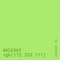 Цвет #ACE96F в цветовой модели RGB обозначается тремя октетами (172, 233, 111) в десятичном формате и #ACE96F в шестнадцатиричном (hex) формате, которые являются интенсивностью красного 172 (hex AC), интенсивность зелёного 233 (hex E9) и интенсивность синего 111 (hex 6F).
