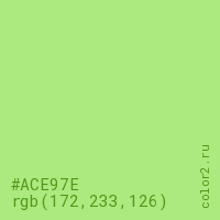 Цвет #ACE97E в цветовой модели RGB обозначается тремя октетами (172, 233, 126) в десятичном формате и #ACE97E в шестнадцатиричном (hex) формате, которые являются интенсивностью красного 172 (hex AC), интенсивность зелёного 233 (hex E9) и интенсивность синего 126 (hex 7E).