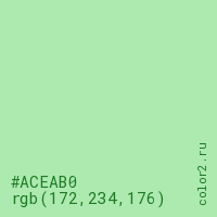 Цвет #ACEAB0 в цветовой модели RGB обозначается тремя октетами (172, 234, 176) в десятичном формате и #ACEAB0 в шестнадцатиричном (hex) формате, которые являются интенсивностью красного 172 (hex AC), интенсивность зелёного 234 (hex EA) и интенсивность синего 176 (hex B0).