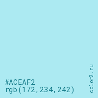 Цвет #ACEAF2 в цветовой модели RGB обозначается тремя октетами (172, 234, 242) в десятичном формате и #ACEAF2 в шестнадцатиричном (hex) формате, которые являются интенсивностью красного 172 (hex AC), интенсивность зелёного 234 (hex EA) и интенсивность синего 242 (hex F2).