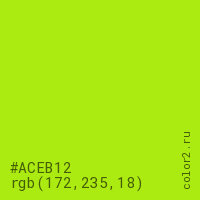 Цвет #ACEB12 в цветовой модели RGB обозначается тремя октетами (172, 235, 18) в десятичном формате и #ACEB12 в шестнадцатиричном (hex) формате, которые являются интенсивностью красного 172 (hex AC), интенсивность зелёного 235 (hex EB) и интенсивность синего 18 (hex 12).
