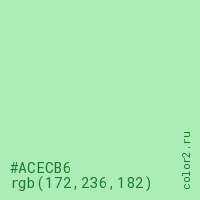 Цвет #ACECB6 в цветовой модели RGB обозначается тремя октетами (172, 236, 182) в десятичном формате и #ACECB6 в шестнадцатиричном (hex) формате, которые являются интенсивностью красного 172 (hex AC), интенсивность зелёного 236 (hex EC) и интенсивность синего 182 (hex B6).