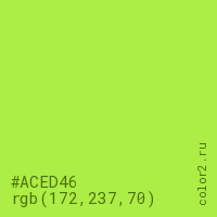 Цвет #ACED46 в цветовой модели RGB обозначается тремя октетами (172, 237, 70) в десятичном формате и #ACED46 в шестнадцатиричном (hex) формате, которые являются интенсивностью красного 172 (hex AC), интенсивность зелёного 237 (hex ED) и интенсивность синего 70 (hex 46).