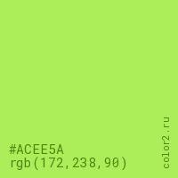Цвет #ACEE5A в цветовой модели RGB обозначается тремя октетами (172, 238, 90) в десятичном формате и #ACEE5A в шестнадцатиричном (hex) формате, которые являются интенсивностью красного 172 (hex AC), интенсивность зелёного 238 (hex EE) и интенсивность синего 90 (hex 5A).