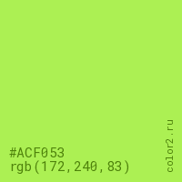 Цвет #ACF053 в цветовой модели RGB обозначается тремя октетами (172, 240, 83) в десятичном формате и #ACF053 в шестнадцатиричном (hex) формате, которые являются интенсивностью красного 172 (hex AC), интенсивность зелёного 240 (hex F0) и интенсивность синего 83 (hex 53).