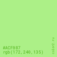 Цвет #ACF087 в цветовой модели RGB обозначается тремя октетами (172, 240, 135) в десятичном формате и #ACF087 в шестнадцатиричном (hex) формате, которые являются интенсивностью красного 172 (hex AC), интенсивность зелёного 240 (hex F0) и интенсивность синего 135 (hex 87).