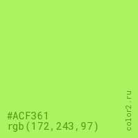Цвет #ACF361 в цветовой модели RGB обозначается тремя октетами (172, 243, 97) в десятичном формате и #ACF361 в шестнадцатиричном (hex) формате, которые являются интенсивностью красного 172 (hex AC), интенсивность зелёного 243 (hex F3) и интенсивность синего 97 (hex 61).