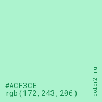Цвет #ACF3CE в цветовой модели RGB обозначается тремя октетами (172, 243, 206) в десятичном формате и #ACF3CE в шестнадцатиричном (hex) формате, которые являются интенсивностью красного 172 (hex AC), интенсивность зелёного 243 (hex F3) и интенсивность синего 206 (hex CE).