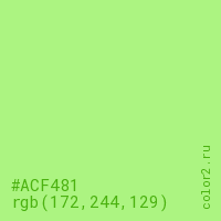 Цвет #ACF481 в цветовой модели RGB обозначается тремя октетами (172, 244, 129) в десятичном формате и #ACF481 в шестнадцатиричном (hex) формате, которые являются интенсивностью красного 172 (hex AC), интенсивность зелёного 244 (hex F4) и интенсивность синего 129 (hex 81).