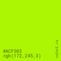 Цвет #ACF503 в цветовой модели RGB обозначается тремя октетами (172, 245, 3) в десятичном формате и #ACF503 в шестнадцатиричном (hex) формате, которые являются интенсивностью красного 172 (hex AC), интенсивность зелёного 245 (hex F5) и интенсивность синего 3 (hex 03).