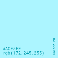 Цвет #ACF5FF в цветовой модели RGB обозначается тремя октетами (172, 245, 255) в десятичном формате и #ACF5FF в шестнадцатиричном (hex) формате, которые являются интенсивностью красного 172 (hex AC), интенсивность зелёного 245 (hex F5) и интенсивность синего 255 (hex FF).
