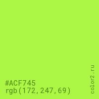 Цвет #ACF745 в цветовой модели RGB обозначается тремя октетами (172, 247, 69) в десятичном формате и #ACF745 в шестнадцатиричном (hex) формате, которые являются интенсивностью красного 172 (hex AC), интенсивность зелёного 247 (hex F7) и интенсивность синего 69 (hex 45).