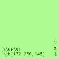 Цвет #ACFA91 в цветовой модели RGB обозначается тремя октетами (172, 250, 145) в десятичном формате и #ACFA91 в шестнадцатиричном (hex) формате, которые являются интенсивностью красного 172 (hex AC), интенсивность зелёного 250 (hex FA) и интенсивность синего 145 (hex 91).