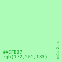 Цвет #ACFBB7 в цветовой модели RGB обозначается тремя октетами (172, 251, 183) в десятичном формате и #ACFBB7 в шестнадцатиричном (hex) формате, которые являются интенсивностью красного 172 (hex AC), интенсивность зелёного 251 (hex FB) и интенсивность синего 183 (hex B7).