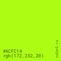 Цвет #ACFC14 в цветовой модели RGB обозначается тремя октетами (172, 252, 20) в десятичном формате и #ACFC14 в шестнадцатиричном (hex) формате, которые являются интенсивностью красного 172 (hex AC), интенсивность зелёного 252 (hex FC) и интенсивность синего 20 (hex 14).