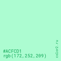 Цвет #ACFCD1 в цветовой модели RGB обозначается тремя октетами (172, 252, 209) в десятичном формате и #ACFCD1 в шестнадцатиричном (hex) формате, которые являются интенсивностью красного 172 (hex AC), интенсивность зелёного 252 (hex FC) и интенсивность синего 209 (hex D1).