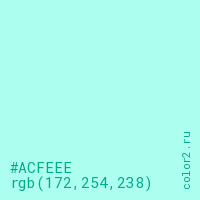 Цвет #ACFEEE в цветовой модели RGB обозначается тремя октетами (172, 254, 238) в десятичном формате и #ACFEEE в шестнадцатиричном (hex) формате, которые являются интенсивностью красного 172 (hex AC), интенсивность зелёного 254 (hex FE) и интенсивность синего 238 (hex EE).
