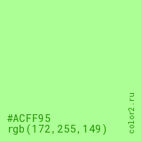 Цвет #ACFF95 в цветовой модели RGB обозначается тремя октетами (172, 255, 149) в десятичном формате и #ACFF95 в шестнадцатиричном (hex) формате, которые являются интенсивностью красного 172 (hex AC), интенсивность зелёного 255 (hex FF) и интенсивность синего 149 (hex 95).