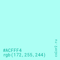 Цвет #ACFFF4 в цветовой модели RGB обозначается тремя октетами (172, 255, 244) в десятичном формате и #ACFFF4 в шестнадцатиричном (hex) формате, которые являются интенсивностью красного 172 (hex AC), интенсивность зелёного 255 (hex FF) и интенсивность синего 244 (hex F4).