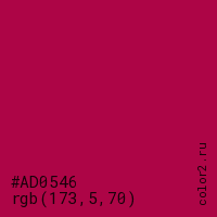 Цвет #AD0546 в цветовой модели RGB обозначается тремя октетами (173, 5, 70) в десятичном формате и #AD0546 в шестнадцатиричном (hex) формате, которые являются интенсивностью красного 173 (hex AD), интенсивность зелёного 5 (hex 05) и интенсивность синего 70 (hex 46).