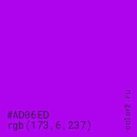 Цвет #AD06ED в цветовой модели RGB обозначается тремя октетами (173, 6, 237) в десятичном формате и #AD06ED в шестнадцатиричном (hex) формате, которые являются интенсивностью красного 173 (hex AD), интенсивность зелёного 6 (hex 06) и интенсивность синего 237 (hex ED).
