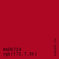 Цвет #AD0724 в цветовой модели RGB обозначается тремя октетами (173, 7, 36) в десятичном формате и #AD0724 в шестнадцатиричном (hex) формате, которые являются интенсивностью красного 173 (hex AD), интенсивность зелёного 7 (hex 07) и интенсивность синего 36 (hex 24).