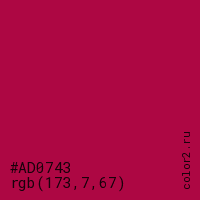 Цвет #AD0743 в цветовой модели RGB обозначается тремя октетами (173, 7, 67) в десятичном формате и #AD0743 в шестнадцатиричном (hex) формате, которые являются интенсивностью красного 173 (hex AD), интенсивность зелёного 7 (hex 07) и интенсивность синего 67 (hex 43).