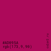 Цвет #AD095A в цветовой модели RGB обозначается тремя октетами (173, 9, 90) в десятичном формате и #AD095A в шестнадцатиричном (hex) формате, которые являются интенсивностью красного 173 (hex AD), интенсивность зелёного 9 (hex 09) и интенсивность синего 90 (hex 5A).