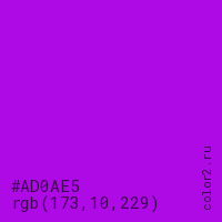 Цвет #AD0AE5 в цветовой модели RGB обозначается тремя октетами (173, 10, 229) в десятичном формате и #AD0AE5 в шестнадцатиричном (hex) формате, которые являются интенсивностью красного 173 (hex AD), интенсивность зелёного 10 (hex 0A) и интенсивность синего 229 (hex E5).