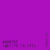 Цвет #AD0FBF в цветовой модели RGB обозначается тремя октетами (173, 15, 191) в десятичном формате и #AD0FBF в шестнадцатиричном (hex) формате, которые являются интенсивностью красного 173 (hex AD), интенсивность зелёного 15 (hex 0F) и интенсивность синего 191 (hex BF).
