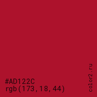 Цвет #AD122C в цветовой модели RGB обозначается тремя октетами (173, 18, 44) в десятичном формате и #AD122C в шестнадцатиричном (hex) формате, которые являются интенсивностью красного 173 (hex AD), интенсивность зелёного 18 (hex 12) и интенсивность синего 44 (hex 2C).