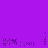 Цвет #AD14ED в цветовой модели RGB обозначается тремя октетами (173, 20, 237) в десятичном формате и #AD14ED в шестнадцатиричном (hex) формате, которые являются интенсивностью красного 173 (hex AD), интенсивность зелёного 20 (hex 14) и интенсивность синего 237 (hex ED).