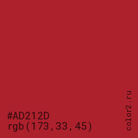 Цвет #AD212D в цветовой модели RGB обозначается тремя октетами (173, 33, 45) в десятичном формате и #AD212D в шестнадцатиричном (hex) формате, которые являются интенсивностью красного 173 (hex AD), интенсивность зелёного 33 (hex 21) и интенсивность синего 45 (hex 2D).