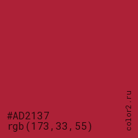 Цвет #AD2137 в цветовой модели RGB обозначается тремя октетами (173, 33, 55) в десятичном формате и #AD2137 в шестнадцатиричном (hex) формате, которые являются интенсивностью красного 173 (hex AD), интенсивность зелёного 33 (hex 21) и интенсивность синего 55 (hex 37).