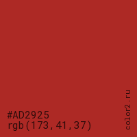 Цвет #AD2925 в цветовой модели RGB обозначается тремя октетами (173, 41, 37) в десятичном формате и #AD2925 в шестнадцатиричном (hex) формате, которые являются интенсивностью красного 173 (hex AD), интенсивность зелёного 41 (hex 29) и интенсивность синего 37 (hex 25).
