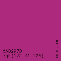 Цвет #AD297D в цветовой модели RGB обозначается тремя октетами (173, 41, 125) в десятичном формате и #AD297D в шестнадцатиричном (hex) формате, которые являются интенсивностью красного 173 (hex AD), интенсивность зелёного 41 (hex 29) и интенсивность синего 125 (hex 7D).