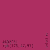 Цвет #AD2F61 в цветовой модели RGB обозначается тремя октетами (173, 47, 97) в десятичном формате и #AD2F61 в шестнадцатиричном (hex) формате, которые являются интенсивностью красного 173 (hex AD), интенсивность зелёного 47 (hex 2F) и интенсивность синего 97 (hex 61).