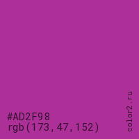 Цвет #AD2F98 в цветовой модели RGB обозначается тремя октетами (173, 47, 152) в десятичном формате и #AD2F98 в шестнадцатиричном (hex) формате, которые являются интенсивностью красного 173 (hex AD), интенсивность зелёного 47 (hex 2F) и интенсивность синего 152 (hex 98).