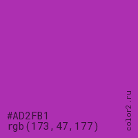 Цвет #AD2FB1 в цветовой модели RGB обозначается тремя октетами (173, 47, 177) в десятичном формате и #AD2FB1 в шестнадцатиричном (hex) формате, которые являются интенсивностью красного 173 (hex AD), интенсивность зелёного 47 (hex 2F) и интенсивность синего 177 (hex B1).